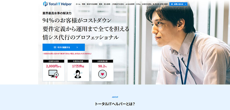リップル株式会社の「トータルITヘルパー」は、ヘルプデスク業務だけでなく、IT資産管理やセキュリティ対策、システム運用支援までを一括して任せられるサービスです。専門知識を持つスタッフが常駐またはリモートで対応するため、突発的なトラブルにも迅速に対応できるのがメリット。 IT関連業務に悩む企業は、幅広い領域を一社でサポートしてもらえる安心感が得られるでしょう。特にIT担当者の負担軽減や業務効率化を重視する場合におすすめです。