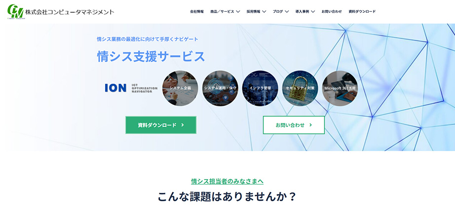 株式会社コンピュータマネジメントが展開する「ION」は、サービス内容を自社のニーズに合わせてカスタマイズできる点が特徴です。業務の一部だけを依頼したい場合や、特定のIT領域に絞ってサポートを受けたい場合にも柔軟に対応できます。 契約形態や提供範囲がフレキシブルなため、変化する業務要件や組織規模に合わせて最適なサービス設計が行えるでしょう。無駄のない外注先を選びたい企業におすすめです。